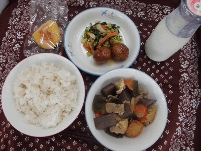 今日の献立は、関東煮(かんとうに)、ごぼう入りつくね、おかかあえ、麦ごはん、牛乳、かきです。