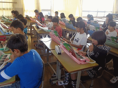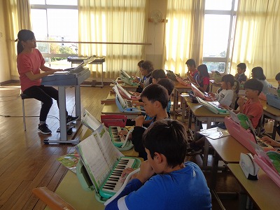 暁先生の演奏に合わせてピアニカで合奏をしています。心地よい音色でした。