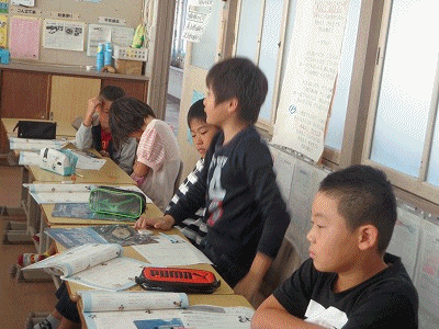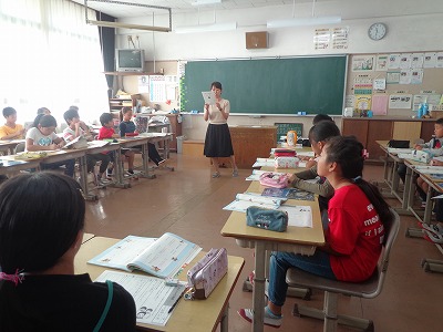 校歌が題材です。授業のまとめの感想では、「心を込めて歌いたい」「感謝して歌いたい」「作った人の気持ちを考えて演奏したい」などの感想が発表されていました。