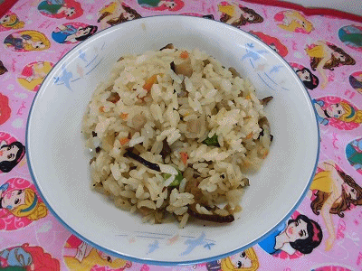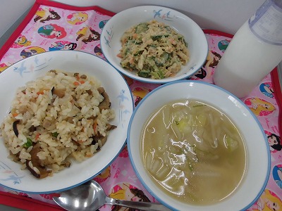 献立は、水(すい)ぎょうざのスープ、バンバンジーサラダ、チャーハン、牛乳です。
