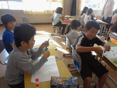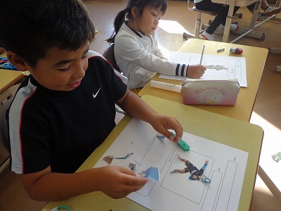先週には、図工で作った変身グッズを使っての変身ショ−がありましたが、今日はその時の写真を使って、その時の気持ちや様子などをまとめる作業をしています。これもまた楽しそうです。