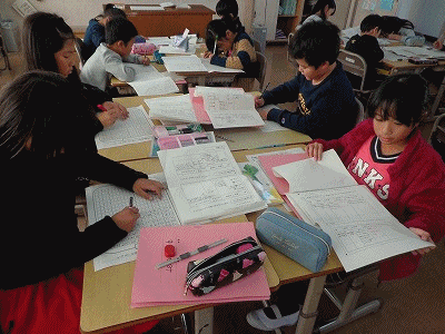 戦争のお話「ちいちゃんのかげおくり」のまとめの作文を書いています。原稿用紙1枚分程度の作文です。みんなこれまでの学習を生かして一生懸命に書いています。