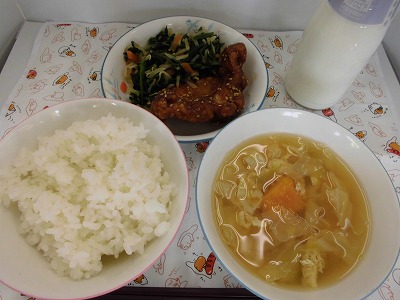 献立は、愛知県産キャベツのみそ汁、鶏肉のてりかけ、ほうれんそうのおひたし、ごはん、牛乳です。