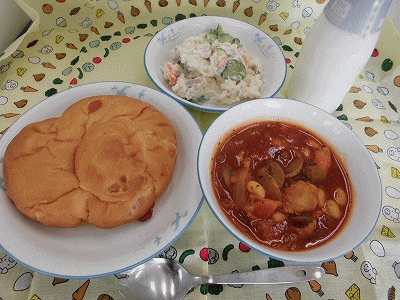 献立は、チキンビーンズ、ポテトサラダ、りんごパン、牛乳です。パンの表面がでこぼこしていますが、これがりんごです。たくさん入っているようです。