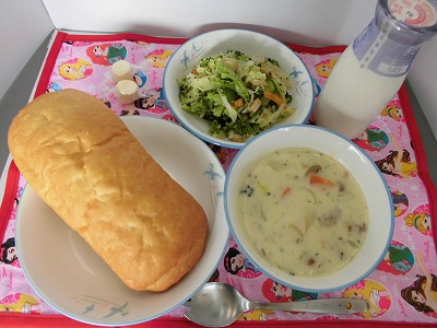 献立は、白菜とかぶのシチュー、ブロッコリーのサラダ、ロールパン、牛乳、キャンディーチーズです。