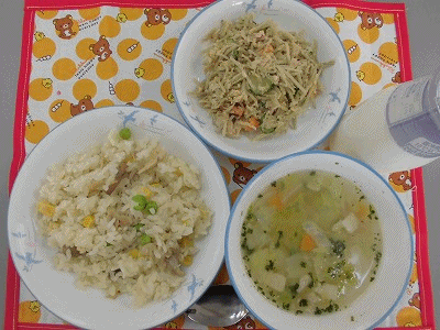 献立は「コンソメスープ、ごぼうサラダ、ピラフ」です。