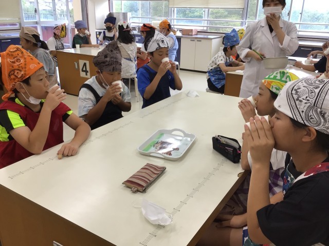 また、栄養教諭からだしについてのお話がありました。だしは、毎日食べている給食にも使われていることを知り、より身近なものに感じた様子でした。昆布だしと、かつおだしの飲み比べもしてみました!