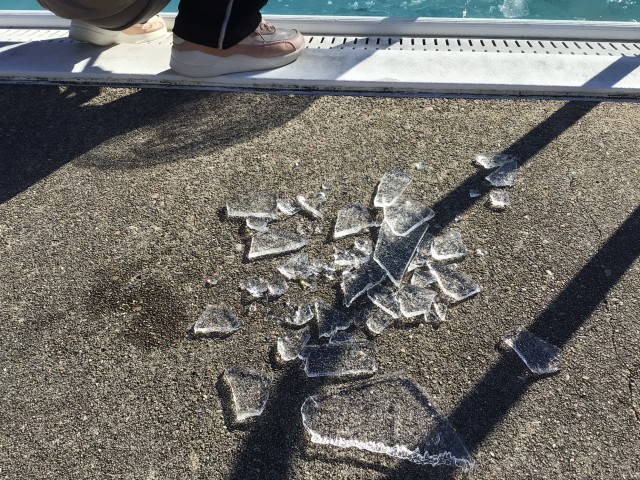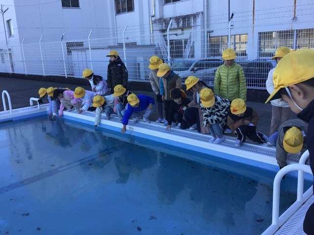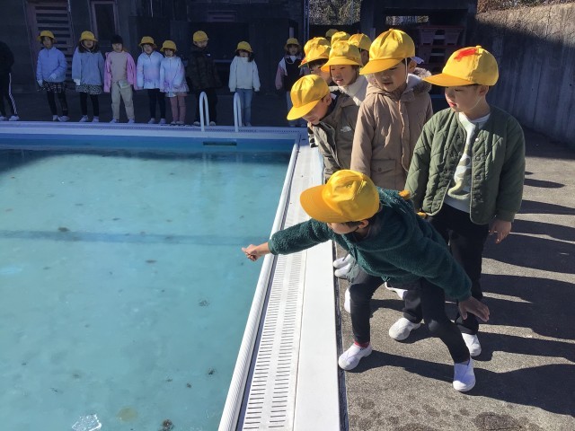 プールの水が凍り、夏とは違う光景が見られました。凍っているプールを見て「すごい!」「きれい~!」と興味津々でした。触ってみたり、氷を滑らせてみたりして遊びました。音や手触りや光方など、新しい発見がたくさんありました♪