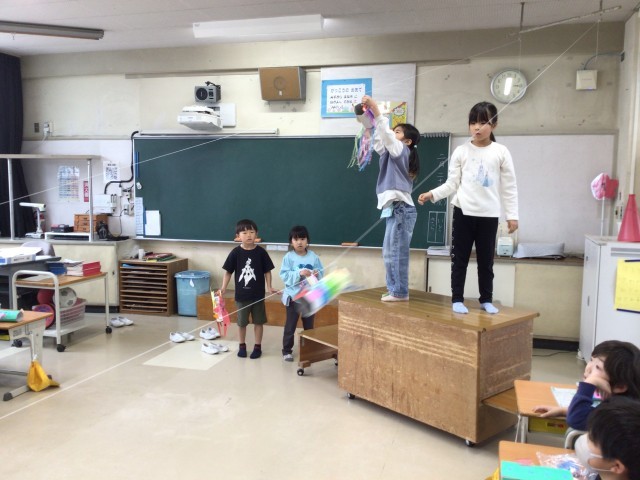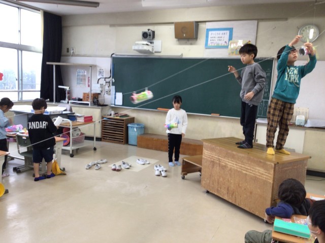 図工の時間に一生懸命作った作品を糸に吊り下げ、ビューン!と滑らせて遊びました。