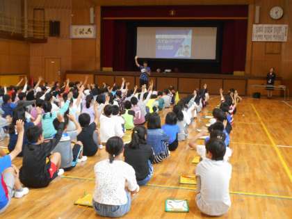 「スマホ、ケイタイ、タブレットを持っている人」と聞くとほとんどの児童が手を上げました。時代の流れからか、小学生が携帯を持っていることが不思議ではない近年、技術だけが発達し、マナーや安全面が追い付いていないのが現状です。携帯は、とても便利なものですが使い方を間違えるとトラブルが発生してしまいます。講義では、SNSで住所が特定され家を荒らされたり、文のとり違いから友達同士の仲が悪くなってしまったりと実際に起きたトラブルを中心に話してくださいました。今回の講義を聞いて資料などを持ち帰ったらぜひ、家族でマナーや安全について話し合っていただきたいと思います。