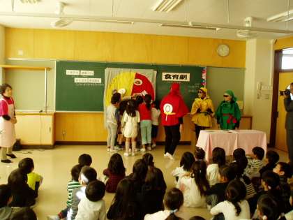 食育学習の一環として、瀬戸市健康づくり食生活改善協議会の方に来ていただき、食育劇を見ました。