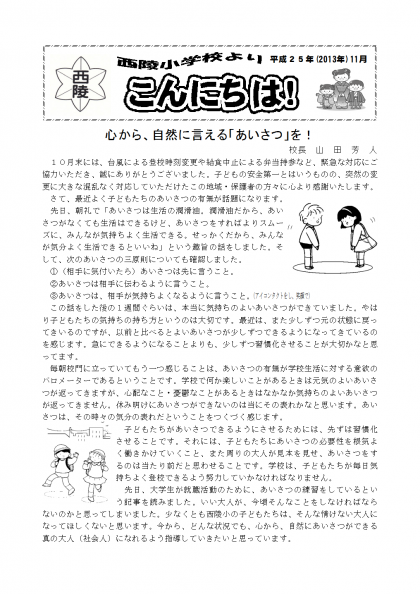 西陵小からこんにちは11月号を掲示します。 子どもたちは、寒さに負けずに頑張って...