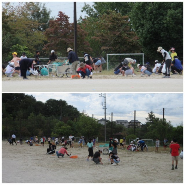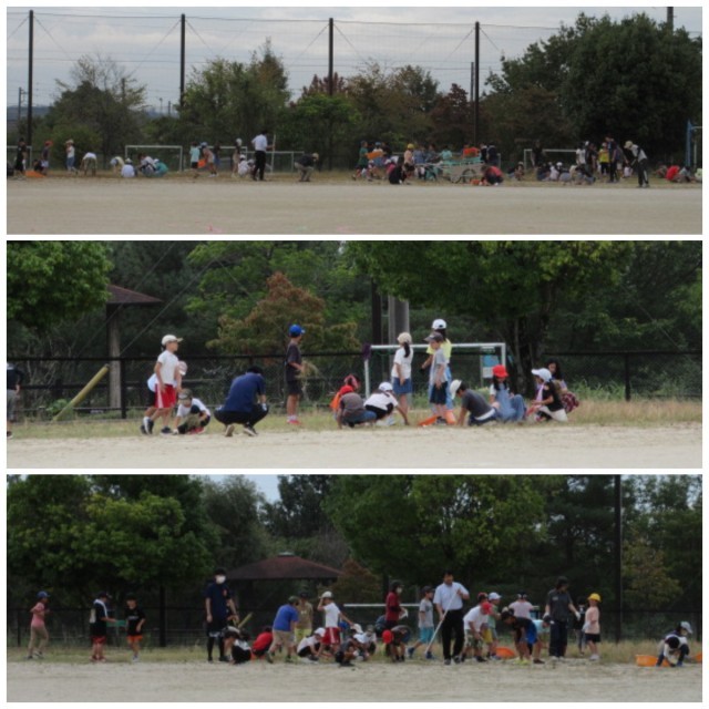 草ぬきぬき隊の活動最終日です。今日は、3年生・4年生・6組7組の子どもたちと先生、ボランティアの方で草ぬきを行いました。あんなにたくさん草が生えていた運動場が、この3日間でとてもすっきりときれいになりました。これで気持ちよく運動会を迎えることができそうですね。