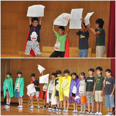 黄色…りきまる(えねるぎーのもとになります)、赤色…にくまる(体を作るもとになります)、白色…ほねまる(ほねをじょうぶにします)、緑色…ベジまる(体の調子をよくします)、紫色…フルーツまる(体の調子を整えます)