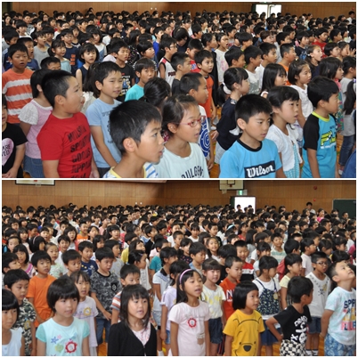 1学期終業式が行われ、体育館に元気な校歌の歌声が響きました。