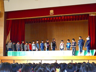今日のおはよう集会は読書集会です。図書委員会のメンバーによる物語を劇にしての紹介です。物語は、斉藤 洋 作「ペンギンたんていだん」と「ペンギンおうえんだん」です。