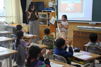 前に出た子が、リズム打ちをしたあとに続いて、クラスのみんなが真似して手拍子を打っています。