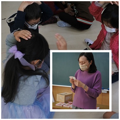 頭の上に手を置いて先生が札を読むのを、息をこらし、集中して取り組んでいました。