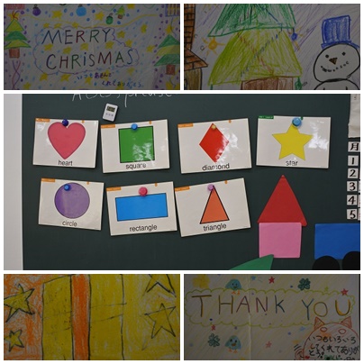 次にそれらの形を使って書いたメッセージカードを黒板に大写しして、友達に紹介しました。その際も、形は英語で発声しました。