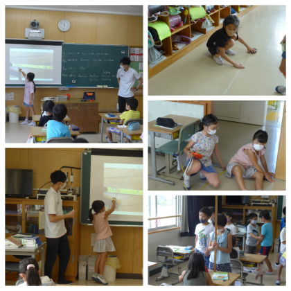 巻き尺や物差しを使って、教室の大きさを測定することに取り組んでいました。