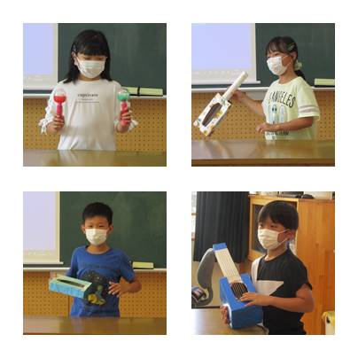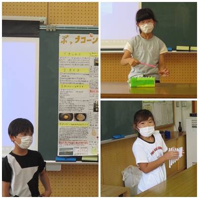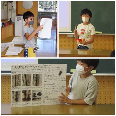 夏休みの宿題をみんなに発表します。読書感想文、自由研究、身近な物を使った楽器・・・どれもなかなかの力作です。2学期の好スタートを切ることができました。
