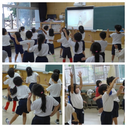 天候不良のため運動場が使用できないため、ダンス動画を見ながら身体を動かしていました。お気に入りのダンス動画にあわせてノリノリの様子の子どもたちでした。