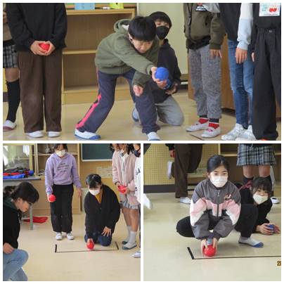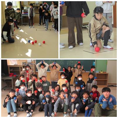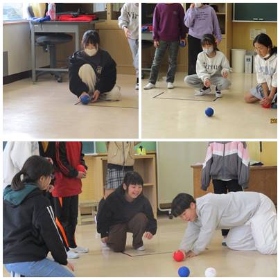 体育館は卒業式の準備で体育館での体育の授業はできません。多目的教室でボッチャを行いました。ボッチャとは年齢、性別、障がいのあるなしにかかわらず、すべての人が一緒に競い合えるスポーツです。みんな大盛り上がりです。