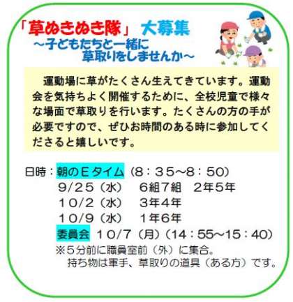 明日は草ぬきぬき最終日です。1年、6年生が、朝のEタイムに草取りを行います。お時間のある方は、ぜひご参加ください。