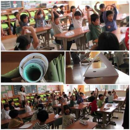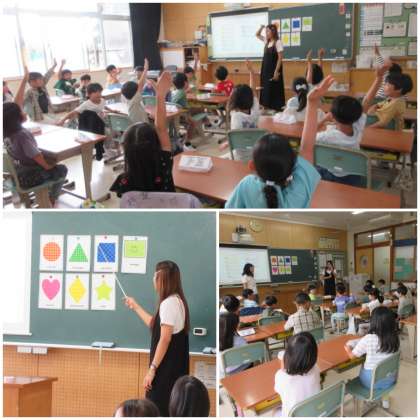 形の勉強をしました。「Where is a cercle?」丸、三角、四角、長四角、ひし形、ハート、星など色々な形をジェスチャーで表したりたくさん探したりしました。