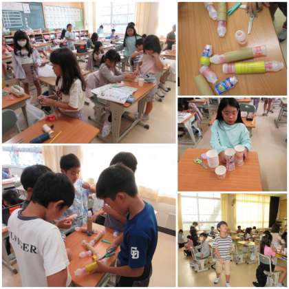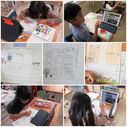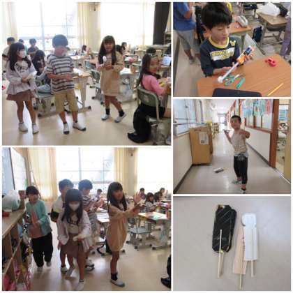 先日行った図書館見学のまとめをしました。先生が撮った写真を見たり図書館の方の話を思い出したりしながら、見学カードに絵や気がついたことをかき込みました。その後、1年生を招待して遊ぶ「おもちゃ祭り」のおもちゃ作りをしました。