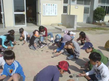 鏡の他にも、日光を集められるものはあるのかな?それでは、虫めがねでやってみようということになり、紙をこがす実験をしました。太陽の向きと虫めがねの向きをうまく合わせるのが難しくて、悪戦苦闘。でも、光が集まり、紙から煙が上がったときは、思わず歓声があふれました。焦げ目ですじや模様を作った子もいましたね。