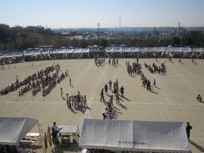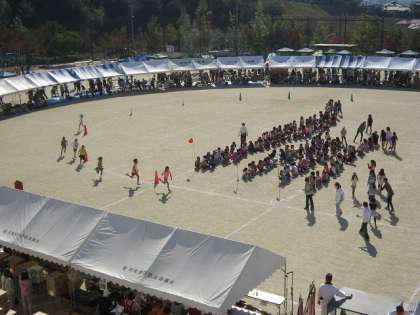 晴天の中、連区の運動会が本校で行われました。東山の子も效範の子も、大人も子どもも仲良く楽しく競技に参加しました。