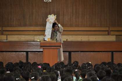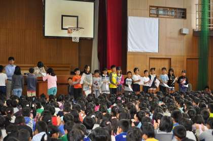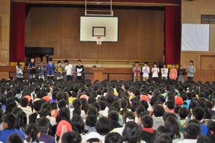 今日の朝会は、数々の表彰と、児童会役員と学級委員の認証がありました。校長先生のお話は、連区の運動会で東山っ子をほめていただいたことについてでした。