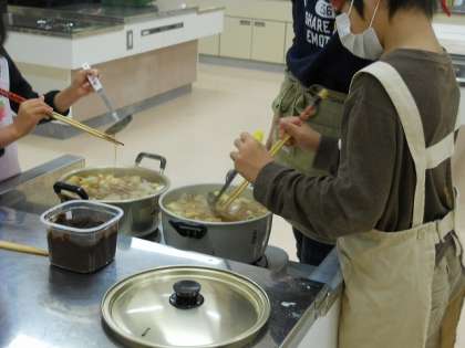 おいしい豚汁を作ったのは、6・7組です。野菜やお肉を洗って切って、鍋で煮ます。あくをとることもします。後片付けまで、全部、自分たちでがんばりました。