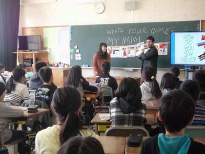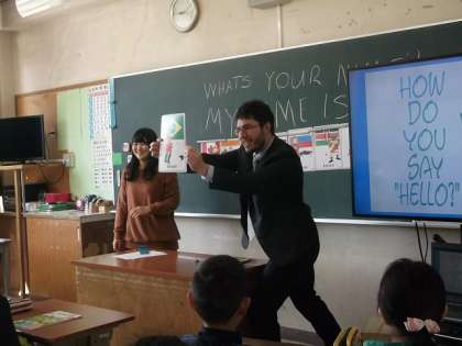 今年度のALTの先生はタイ・リード先生。オーストラリア出身です。タイ先生とおよびします。今日は5年生の授業でした。とってもパワフルで楽しい授業でした。