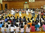今回、5年生が野外活動でのスタンツの一部を発表しましたが 、体育館の中央で演技しましたが、円形に囲んでの隊形で発表・参観しました。
