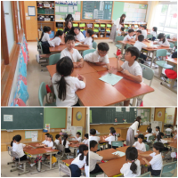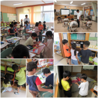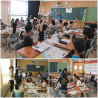 3年生の図工です。先生たちが、お互いの授業を参観して勉強する時間です。子どもたち...