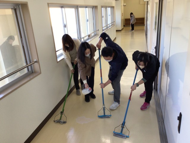 職員で廊下のワックスがけをしました。