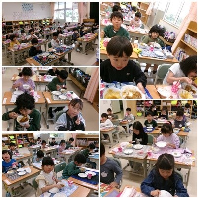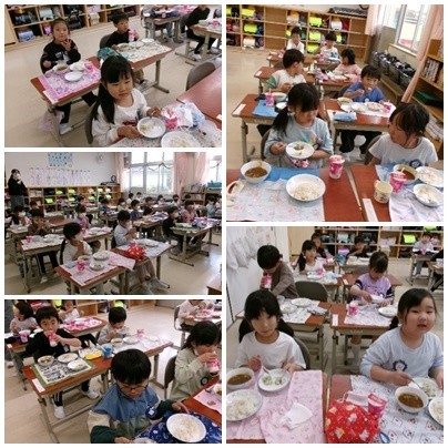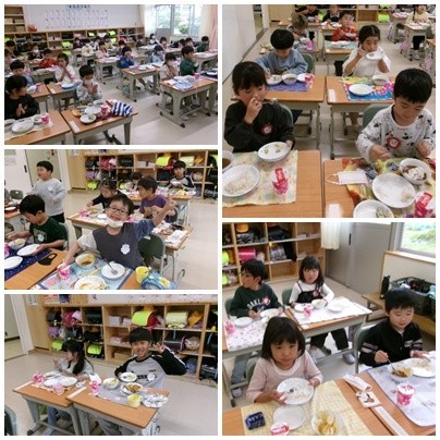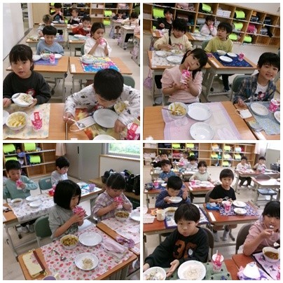「すごくおいしい!」と言ってもりもり食べていました。おかわりもよくしていました。本当に食べられるかな、と先生たちは心配していましたが、食缶はからっぽ。しかもみんな時間内に食べ終わりました。すごい!明日からもよく食べましょう!
