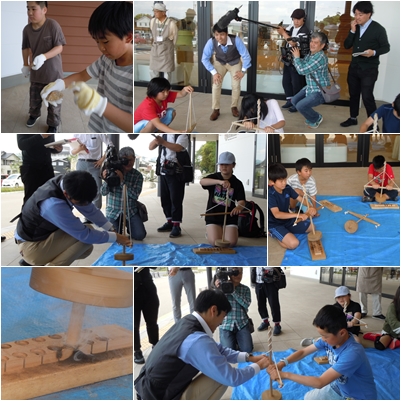 屋内、屋外の展示をガイドさんに説明してもらったり、火起こし体験などをしています。