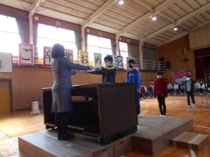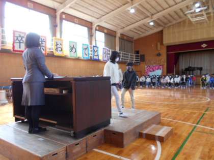 6年生が入場し、国歌と校歌を心の中で歌った後、いよいよ証書授与が始まります。