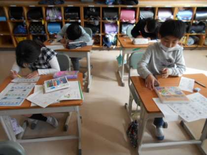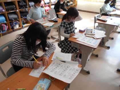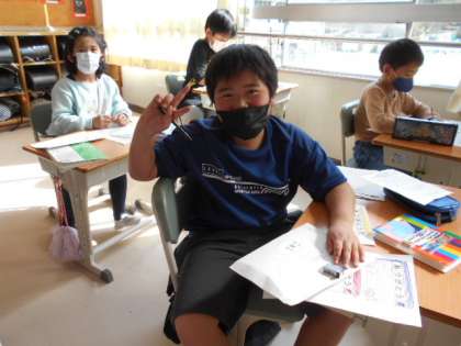ありがとうカードを書いています。友達のすてきなところをどんどん見つけています。