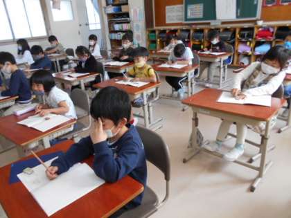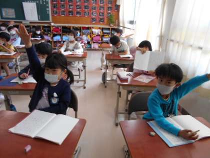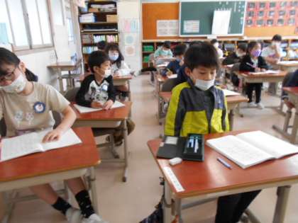 片仮名で書く言葉を見つけ発表すると、みんながその言葉をノートに書いていました。