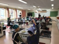 学校の中をめぐり、部屋や場所の名前を英語で言っていました。