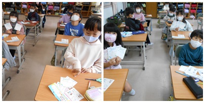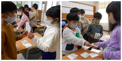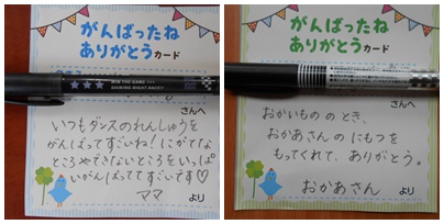 おうちの人にも書いていただいた「がんばったね・ありがとう」カードを、今度は学級の友達にも書いて渡しました。