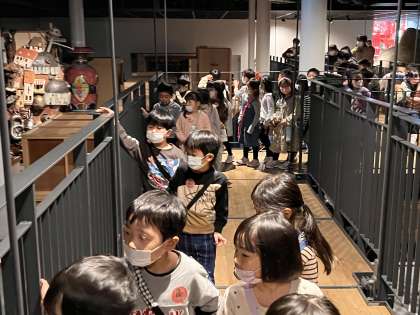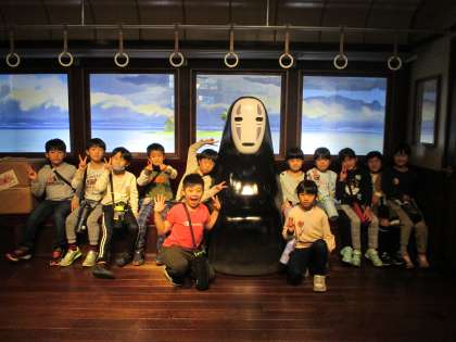 大倉庫の中は並んで見学しました。カオナシと一緒に写真を撮り、子どもの街とネコバスルームで遊びました。隠れているまっくろくろすけを見つけて感動していました。