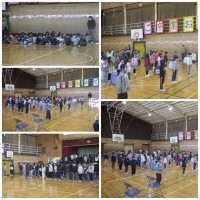 広い体育館にお祝いのお花も飾られています。