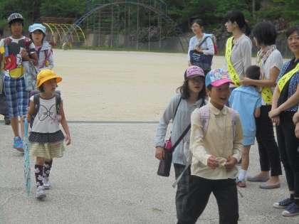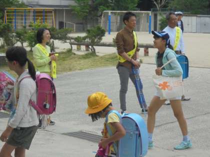 5年生が野外活動に出発する前には、あいさつ運動がありました。5月と比べ、子どもたちのあいさつの声と笑顔が増えました。