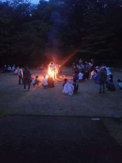 キャンプファイヤが始まりました。雨を吹き飛ばすくらい盛り上がっています。