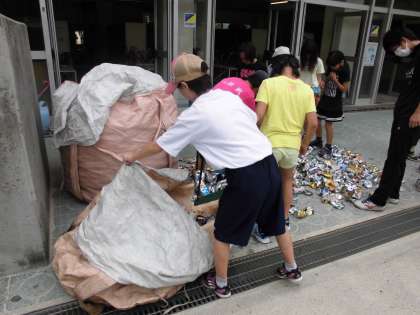 玄関では児童会の役員が缶をつぶして大きな袋に入れていきました。今日だけでたくさん集まりました。